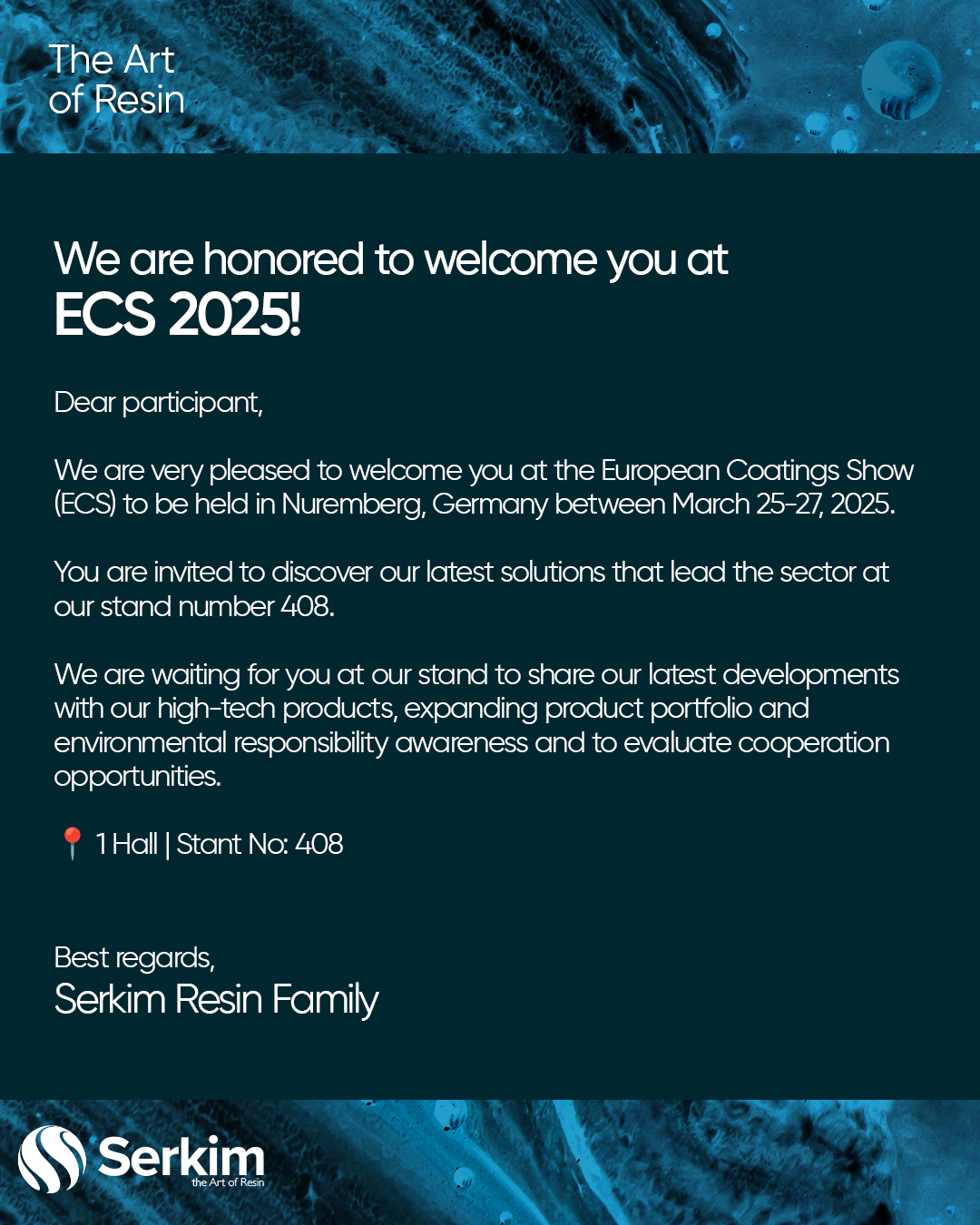 Dear Business Partners,As Serkim Resin, we will showcase our innovative resin solutions and our product portfolio focused on high durability...
